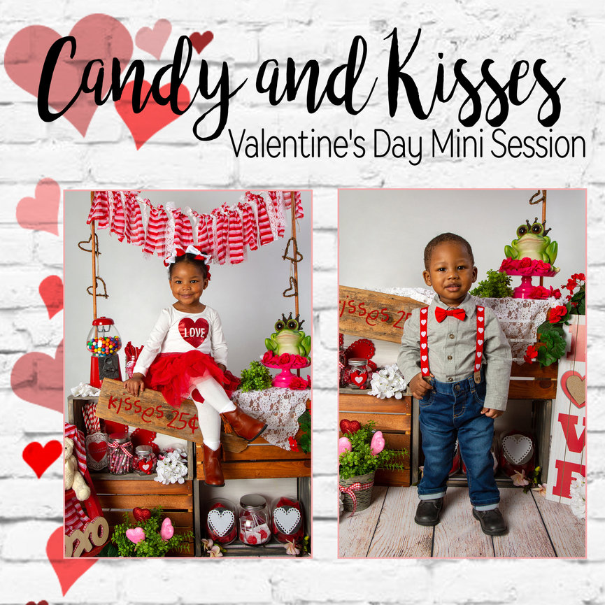 Kisses and Candy - Our Valentine’s Day Mini Session. Our kissing booth is full of hearts and Valentine's candies, perfect for your little Valentine!